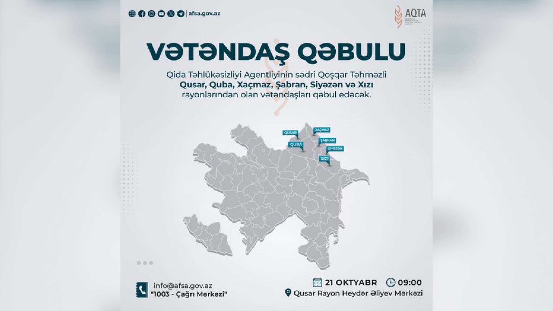 Azərbaycan Respublikası Qida Təhlükəsizliyi Agentliyinin (AQTA) sədri Qoşqar Təhməzli Qusar, Quba, Xaçmaz, Şabran, Siyəzən, Xızı rayonlarından olan vətəndaşları qəbul edəcək.