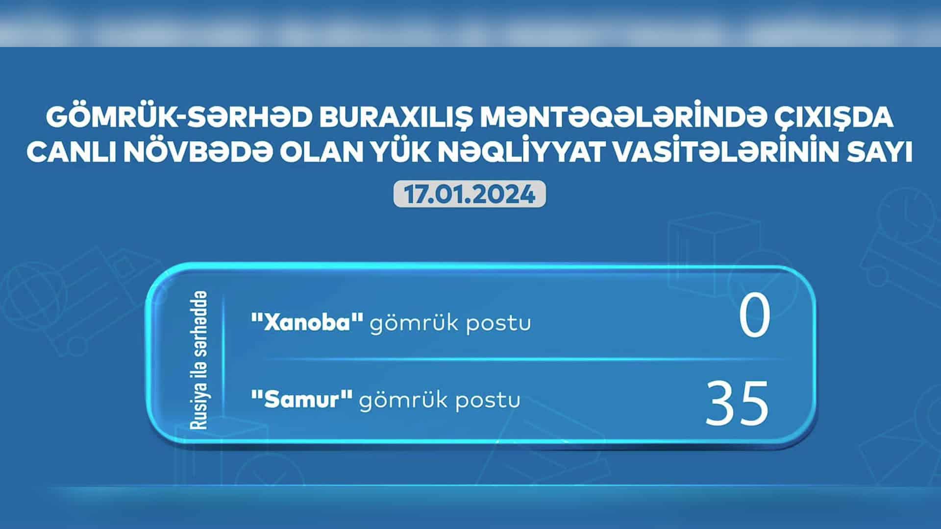 Bu günə olan statistikaya əsasən, “Samur” gömrük postunda (Qusar) 35 maşın gözləyir, “Xanoba” gömrük postunda (Xaçmaz) isə gözləyən yük maşını yoxdur.