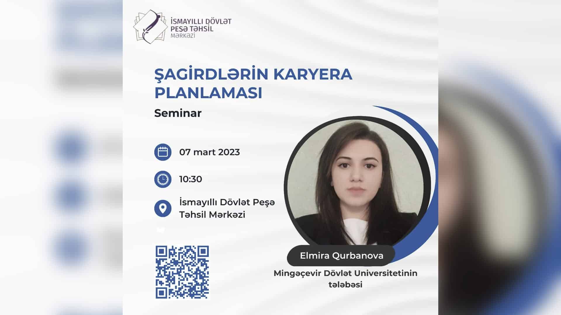 Tədbir martın 7-si saat 10:30-da baş tutacaq. İsmayıllı DPTM-də "Şagirdlərin karyera planlaması" mövzusunda seminar Elmira Qurbanova tərəfindən aparılacaq. Burada əsas məqsəd tələbələrin müvafiq sahədə bilik və bacarıqlarının artırılmasıdır.