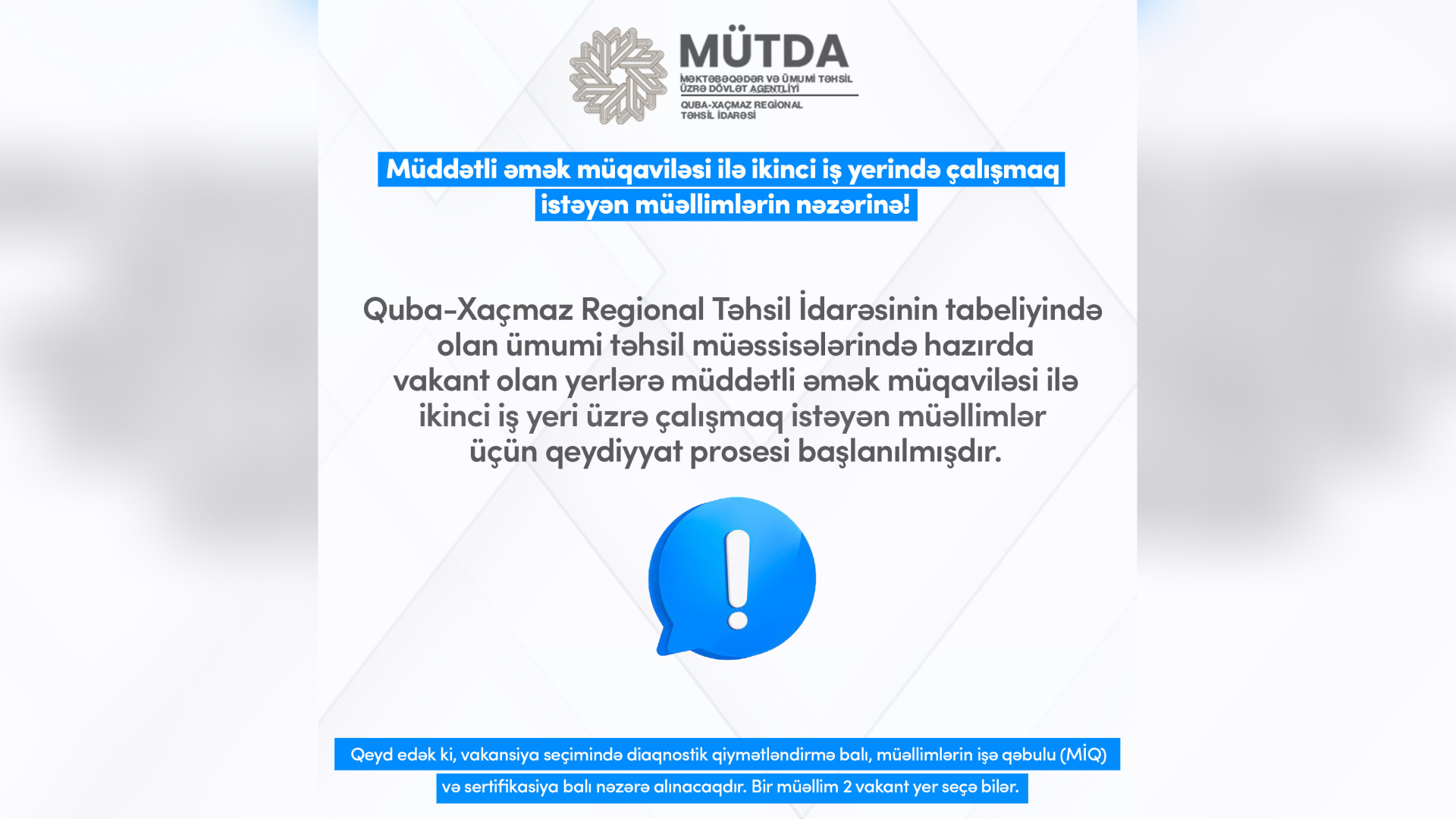 Bir müəllim 2 vakant yer seçə bilər. İş təklifləri ilə burada tanış olmaq olar.