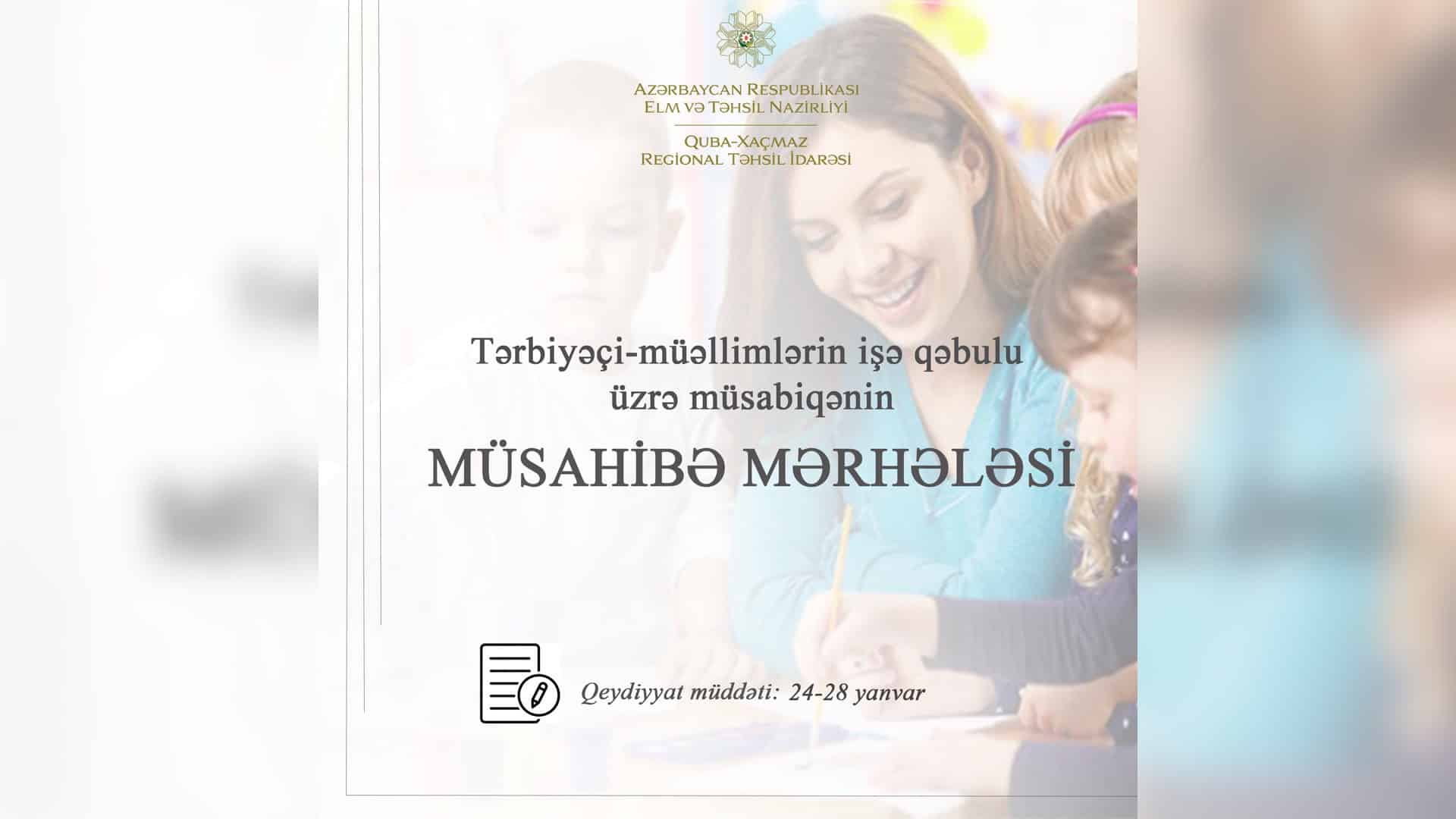 Quba-Xaçmaz Regional Təhsil İdarəsi məktəbəqədər təhsil müəssisələrində tərbiyəçi-müəllim vəzifəsinə işə qəbul müsabiqəsinin müsahibə mərhələsini keçirəcək. Bu haqda ShimalNews 25 yanvar tarixində məlumat verir.