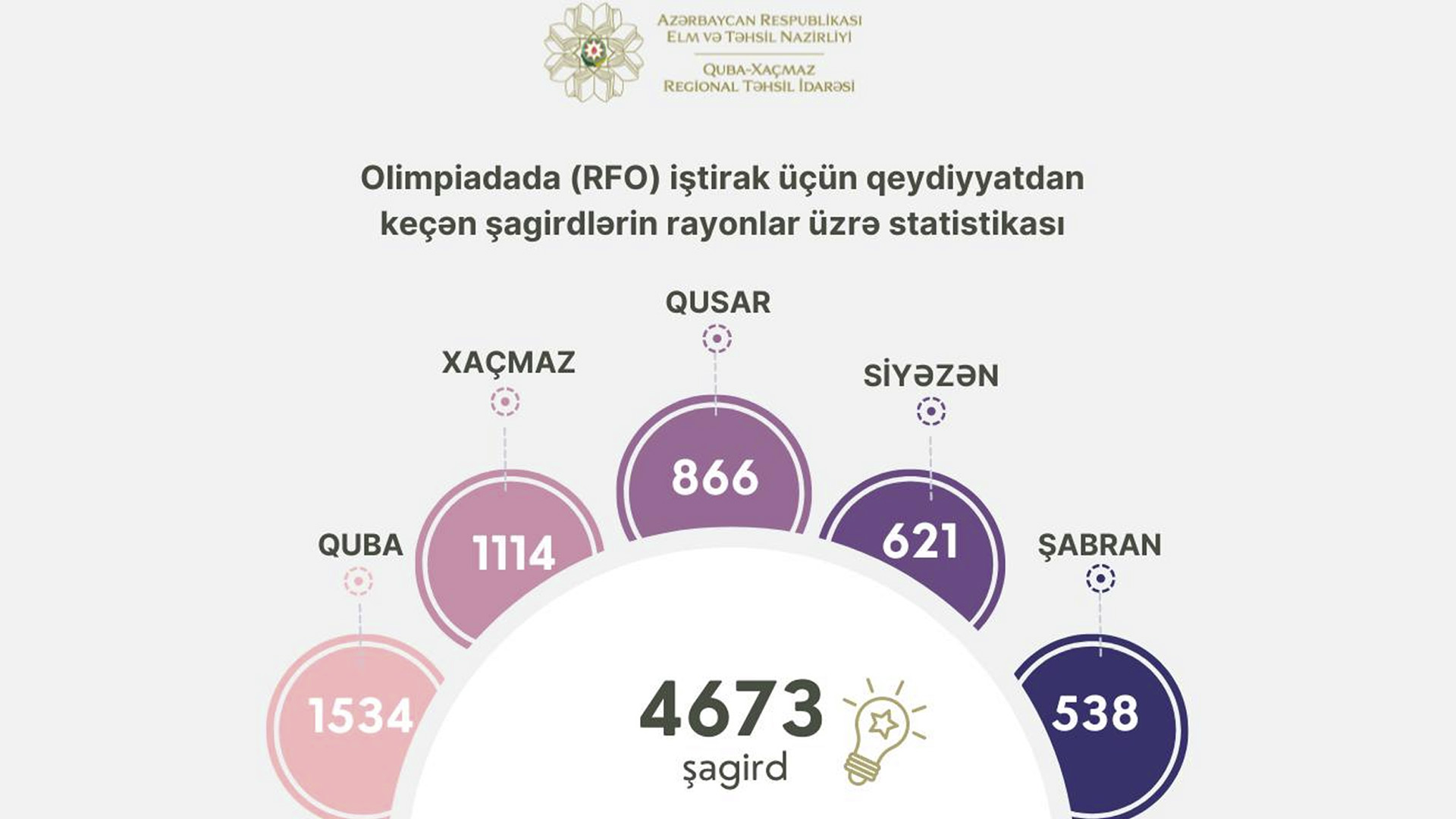 Bilik yarışında 4673 şagird iştirak etmək üçün qeydiyyatdan keçib. Rayonlar üzrə onlar: Quba - 1534, Xaçmaz - 1114, Qusar - 866, Siyəzən - 621, Şabran - 538 nəfər təşkil edir.