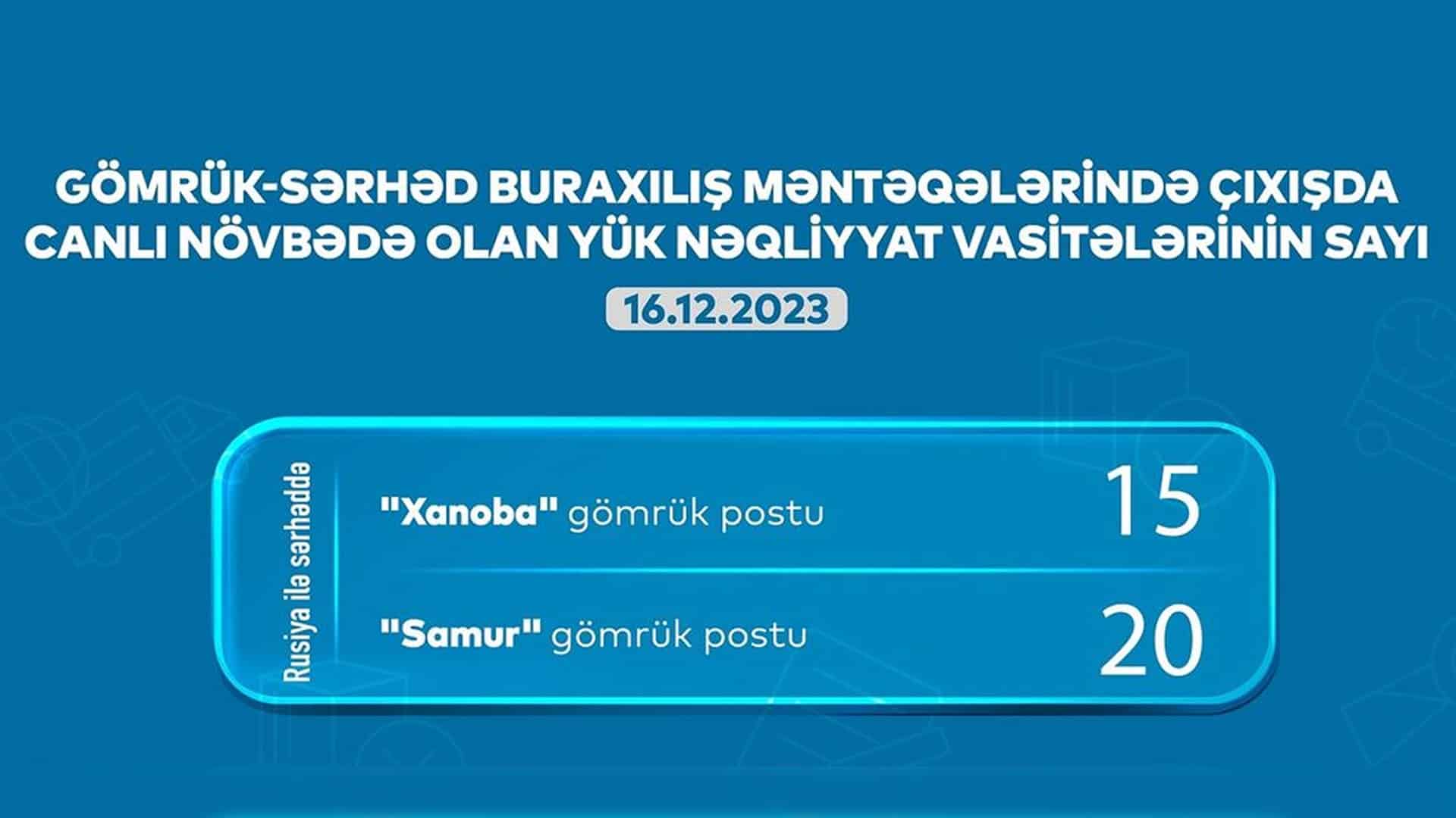 Bu günə olan statistikaya əsasən, “Samur” gömrük postunda 20 (Qusar), “Xanoba” gömrük postunda (Xaçmaz) isə 15 yük maşını var.