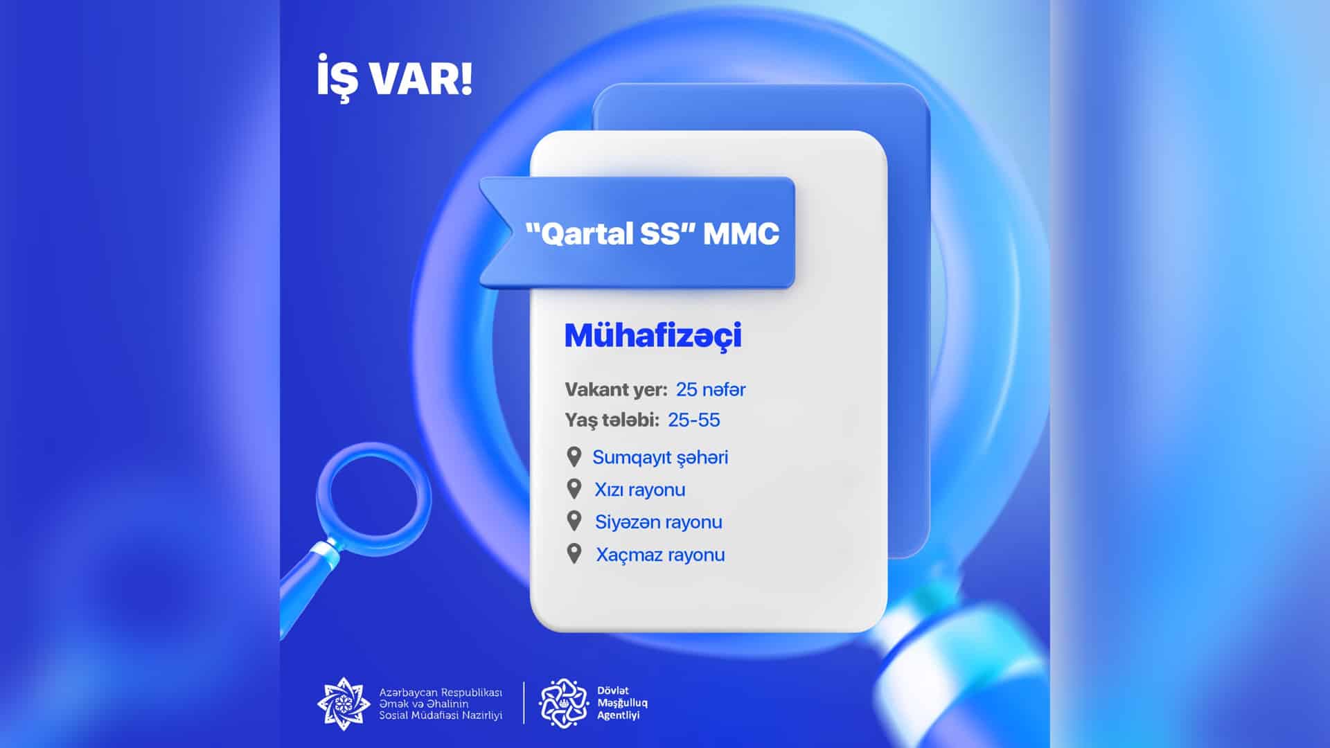 “Qartal SS” MMC şirkəti “Mühafizəçi” vəzifəsinə 25 boş iş yeri üzrə qəbula başlayıb. Xaçmaz, Xızı və Siyəzən rayonlarından olan şəxslər müraciət etmək üçün Quba-Xaçmaz Regional Məşğulluq filialına yaxınlaşa bilərlər.