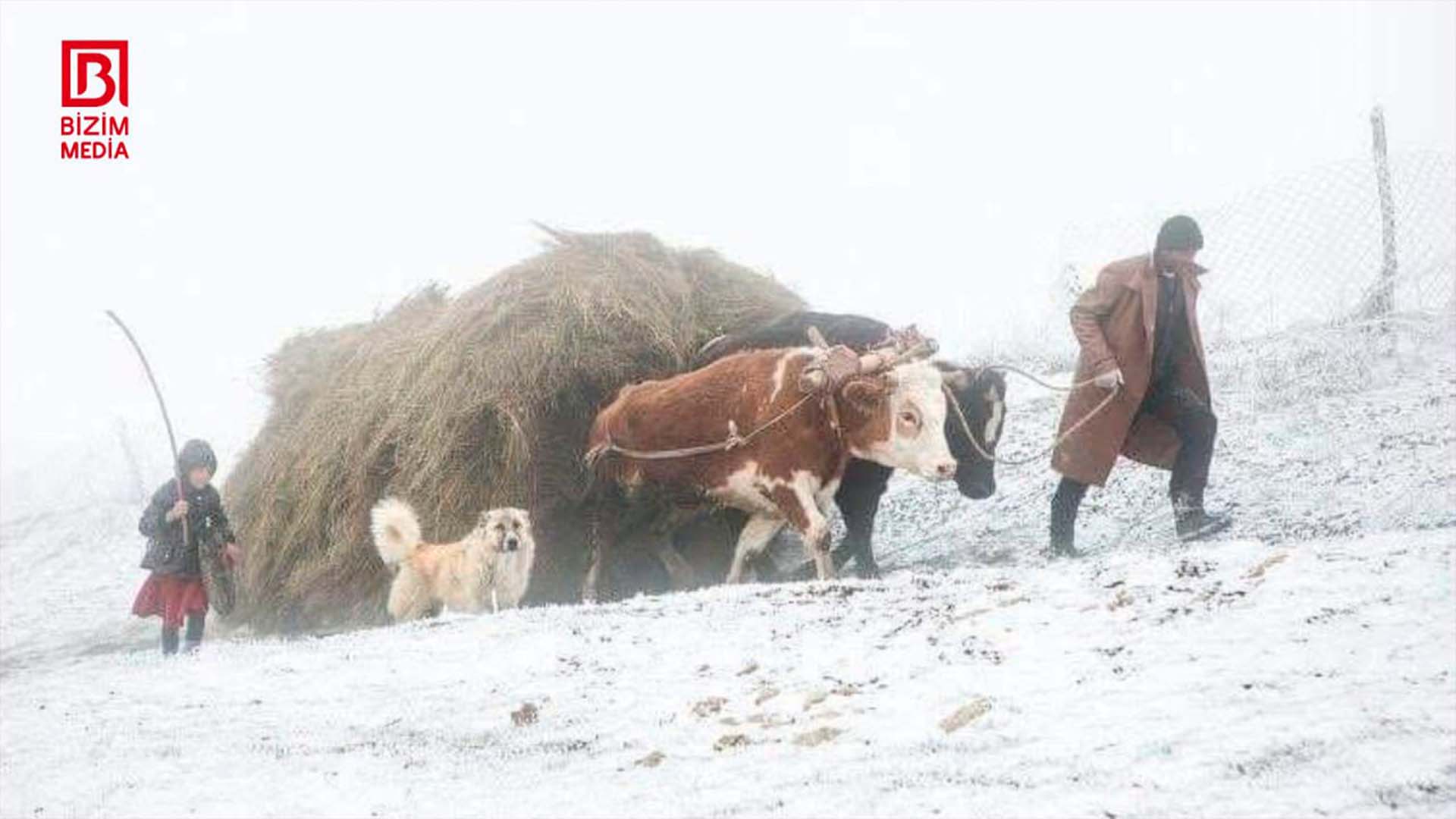 Çox təbii və reallığı yerindəcə tutan fotoda kəndli öküzlər qoşulan kirşə ilə heyvanlarına quru ot gətirir. Yanında məktəbli qız və it də gedirlər.