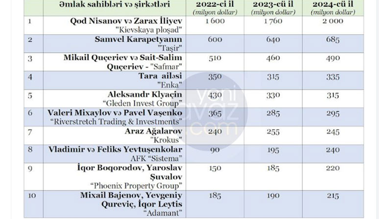 Yeniavaz.сom xəbər verir ki, bu barədə məlumat dünyanın aparıcı nəşrlərindən olan "Forbes” nəşri tərəfindən hazırlanan "Rusiyanın daşınmaz əmlak kralları” adlı hesabatda yer alıb.