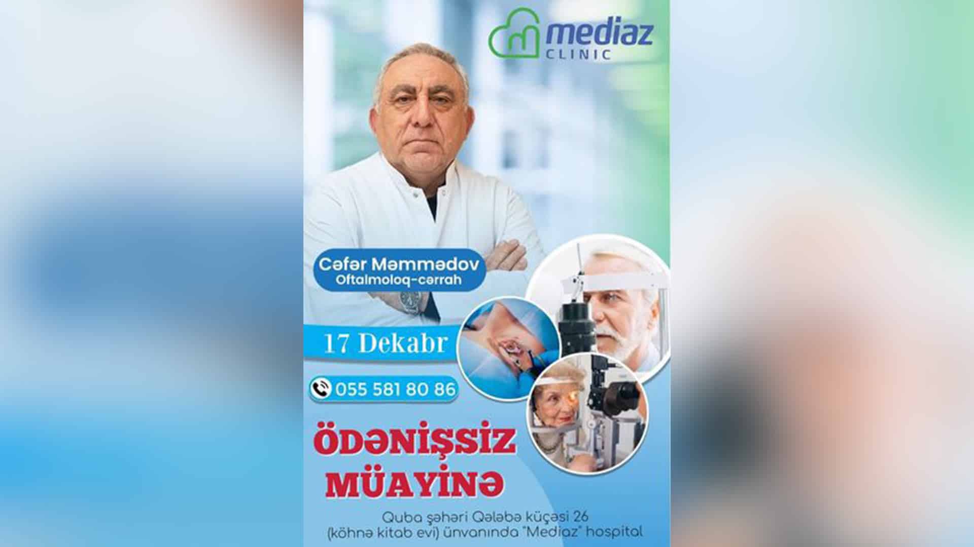 Qəbul 17 dekabr tarixində “Mediaz Hospital” klinikasında təşkil olunacaq. Öncədən qeydiyyat vacibdir.